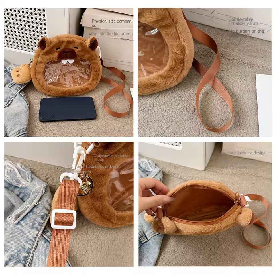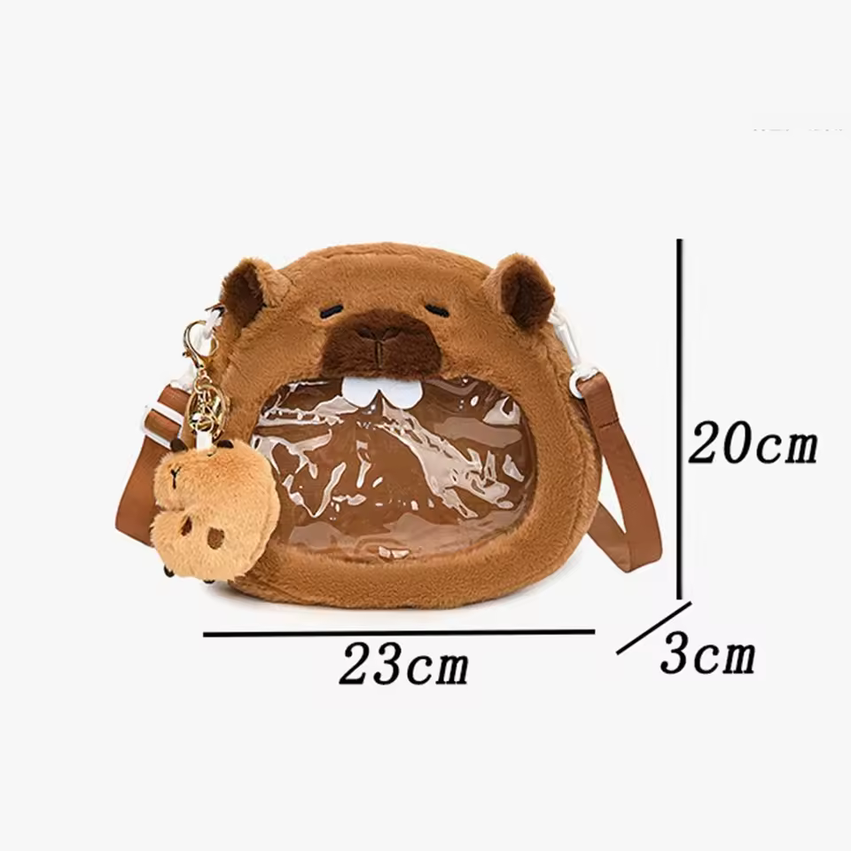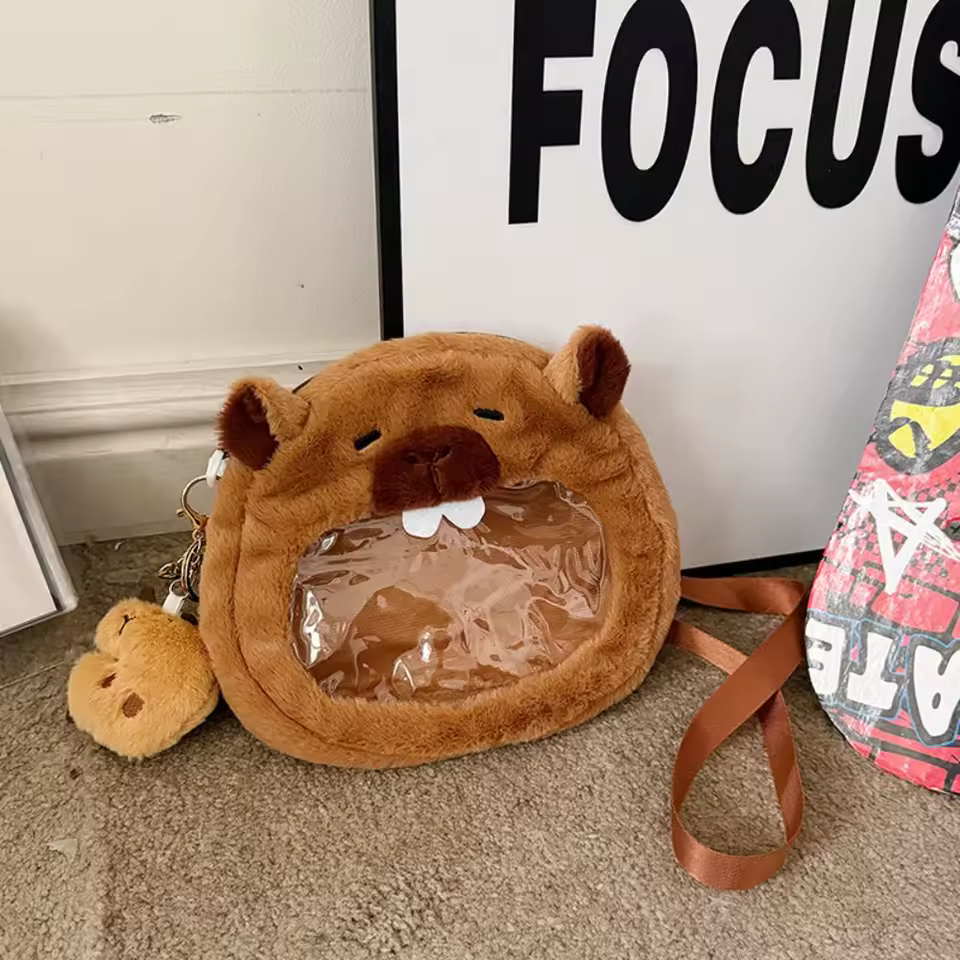 Adorable plush capybara shoulder bag with a transparent front pocket, perfect for displaying your favorite pins, charms, or accessories. The soft and fluffy design makes it both cute and stylish. Comes with an adjustable strap and a mini capybara keychain. Lightweight and practical for everyday use or as a unique gift.