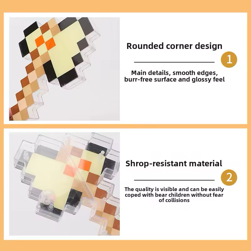 Оживете гейминг приключенията на вашето дете с тази страхотна пикселна LED брадва! Вдъхновена от света на Minecraft, играчката свети в ярки цветове – идеална е както за игра, така и за декорация. Независимо дали създават свои собствени истории или допълват костюма си, тази светеща брадва придава магическо геймърско усещане. Безопасна, лека и забавна за всички възрасти!