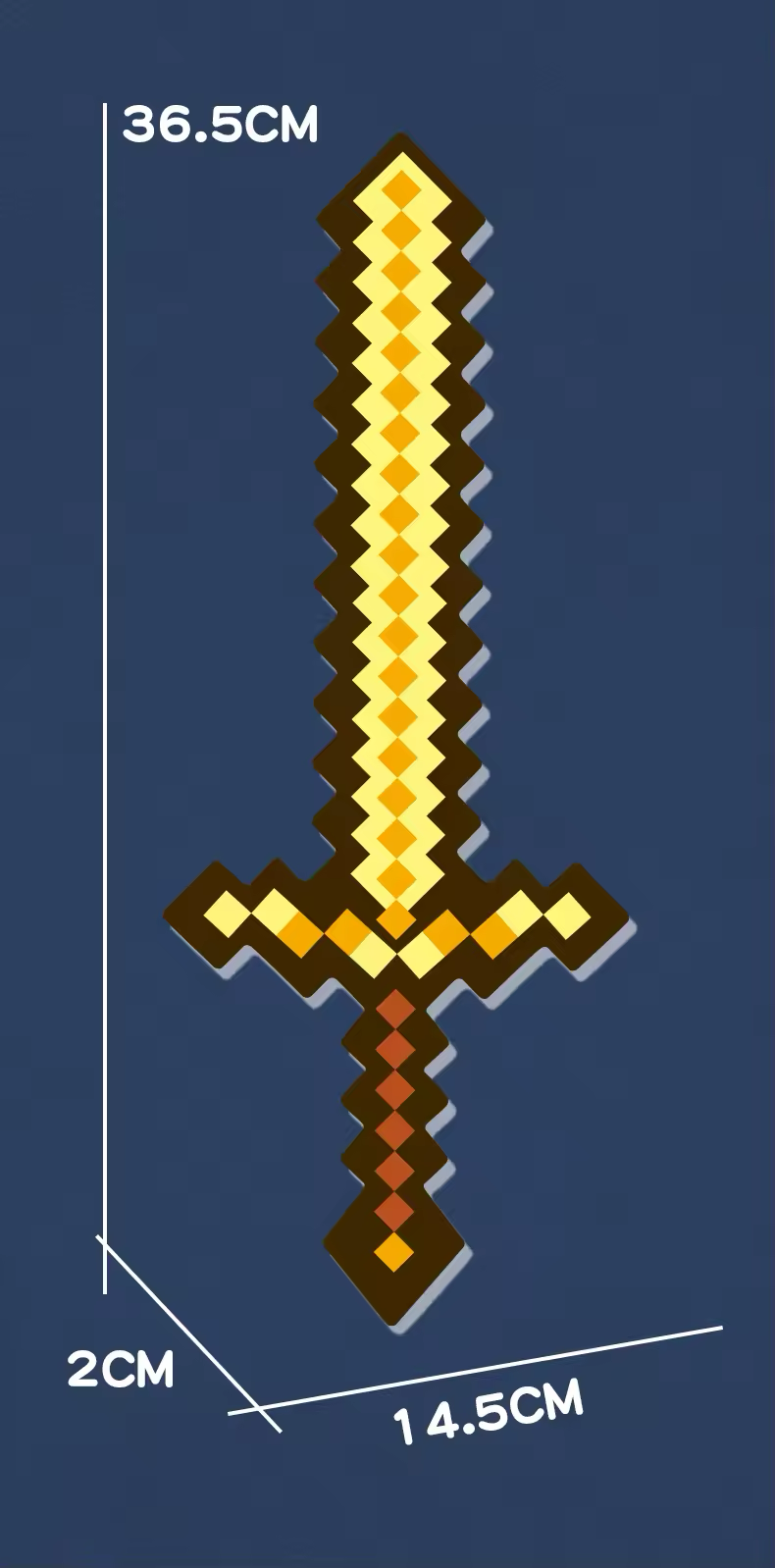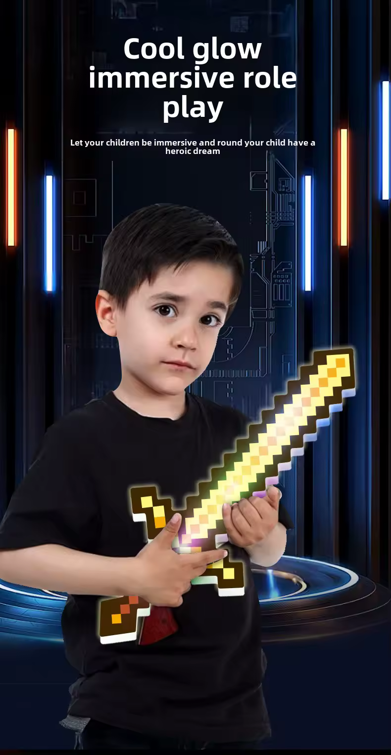 Влез в пикселизирания свят с този светещ LED диамантен меч! Перфектен за феновете на Minecraft от всички възрасти, този меч свети в ярки цветове и добавя вълнение към игрите, костюмираните партита или ролевите игри. Безопасен, здрав и привличащ вниманието – това е задължителен аксесоар за всеки малък геймър!